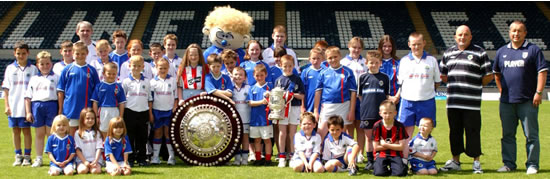 On Open Day Junior Blues members posed for a team photo on the Windsor Park pitch with the Irish League and Co. Antrim Shield trophies won by Linfield last season.